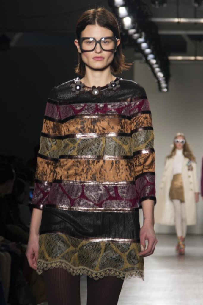 También los pantalones acampanados con lamé de oro y lana y los abrigos largos geométricos que consisten en napa muy suave laminada con brillo, cobres, jacquard de pelo largo y rafia sobre base de algodones y lanas.